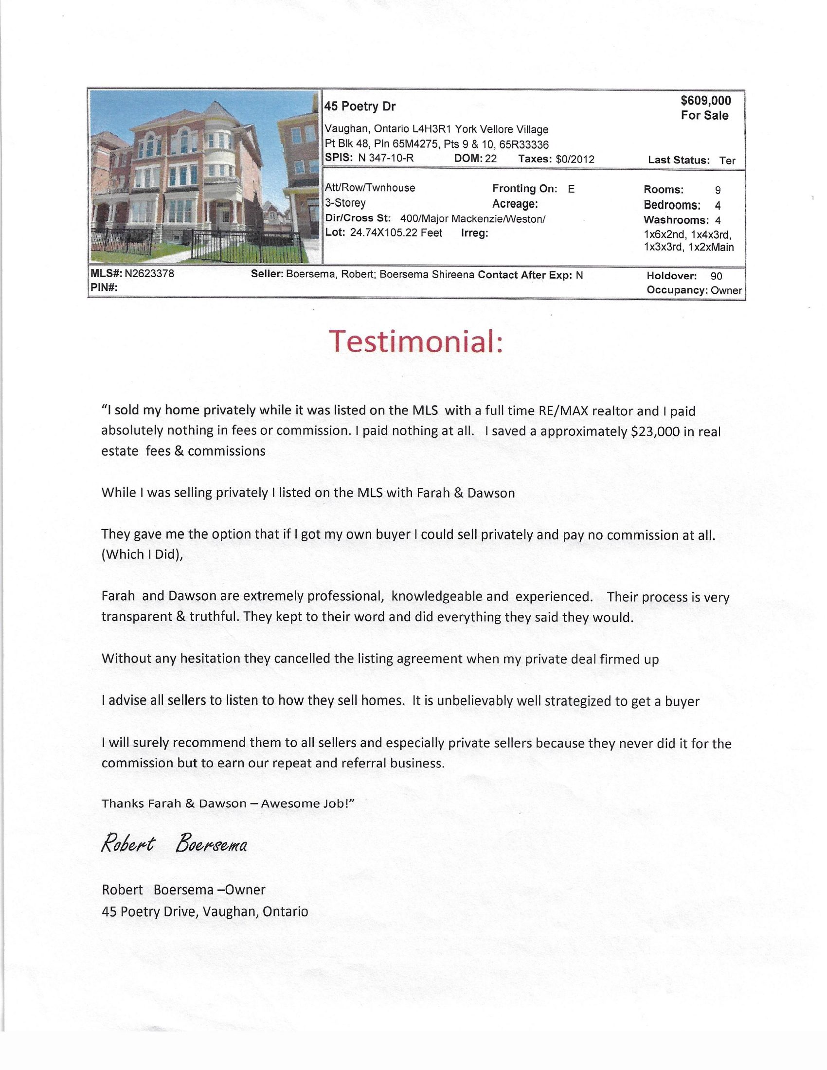 This is to confirm that my home 27 St Hubert Drive was listed on ByTheOwner.co, but i was unable to sell it privately.